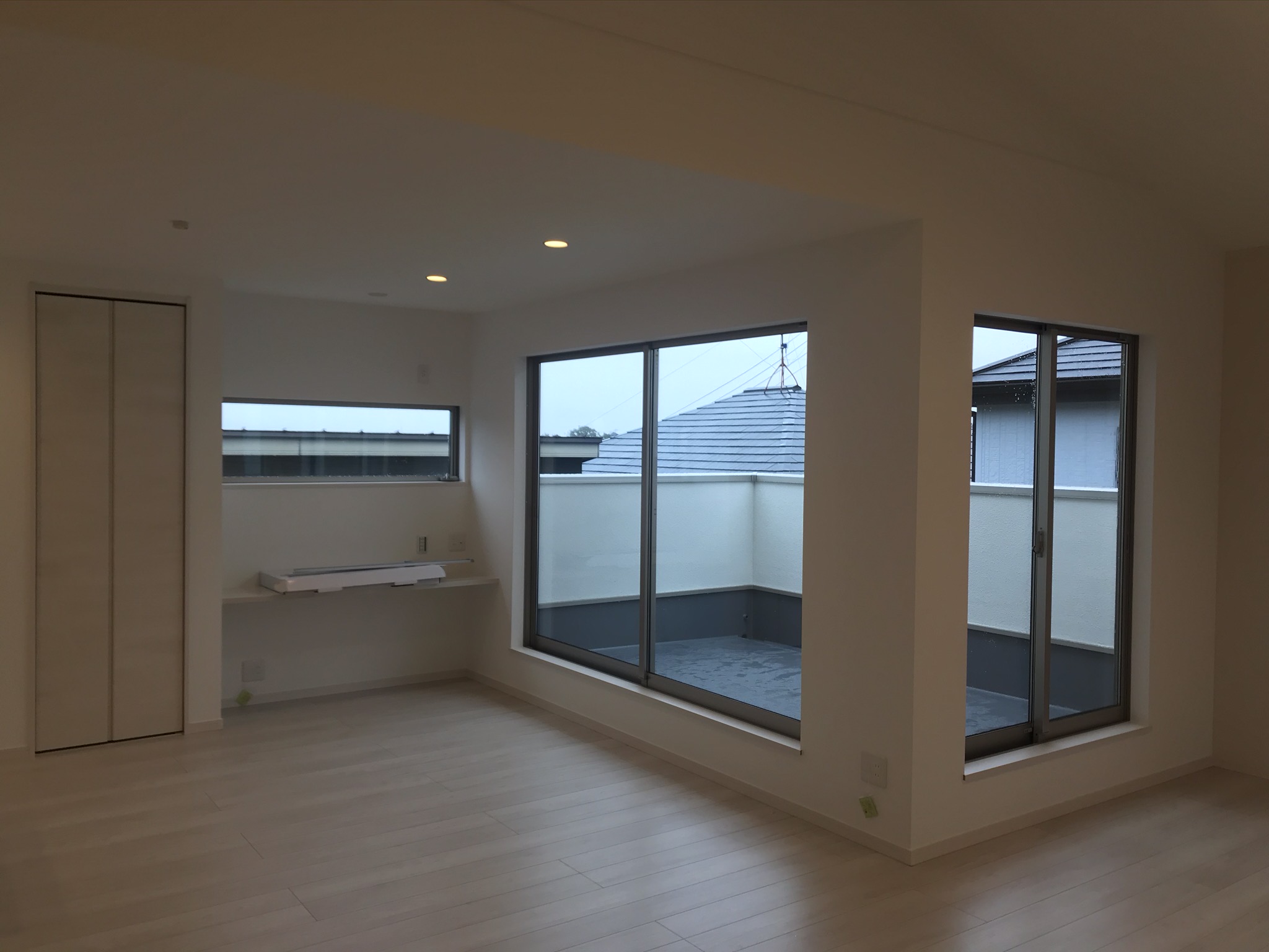隣接建物の関係もあり、家族が一番長く過ごすLDKをより快適に過ごせるよう2階に設置した注文住宅。25帖を越えるLDKは、高天井や6帖近いバルコニーによってよりゆったりと感じられ、キッチン前には階段吹き抜けとの間に室内窓を設け背面にもコーナーウインドございますので、キッチンも明るく快適です。
